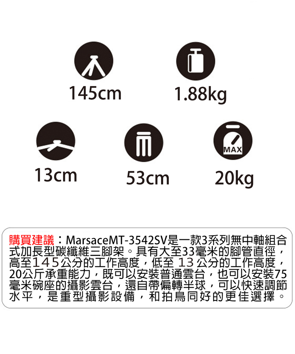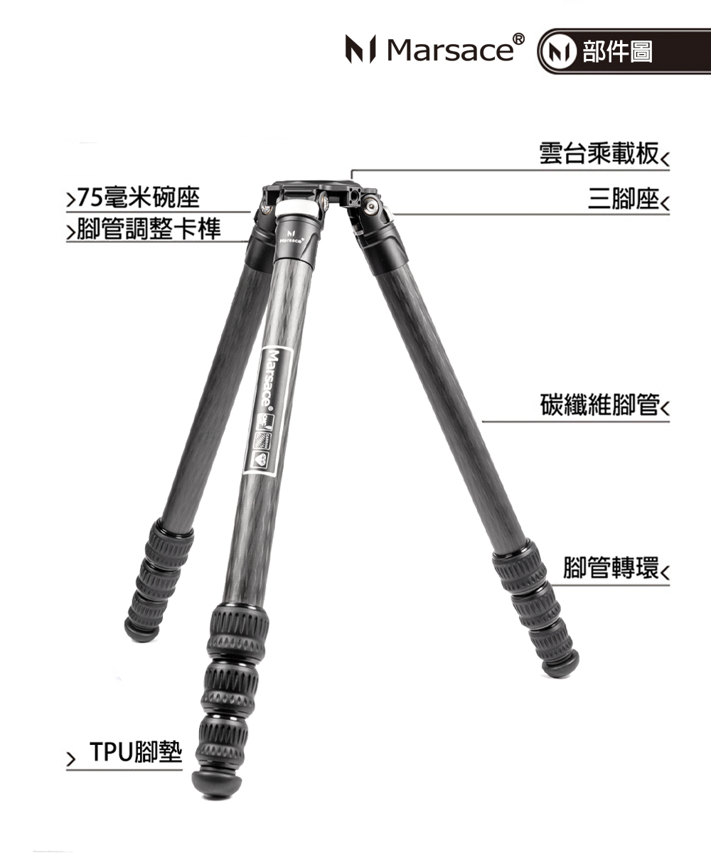 Marsace MT-3542SV 是一款專業級碳纖維三腳架,採用 10 層碳纖維 設計,兼具輕量與高剛性,內建 75mm 標準碗座,特別適合錄影與長焦攝影應用。