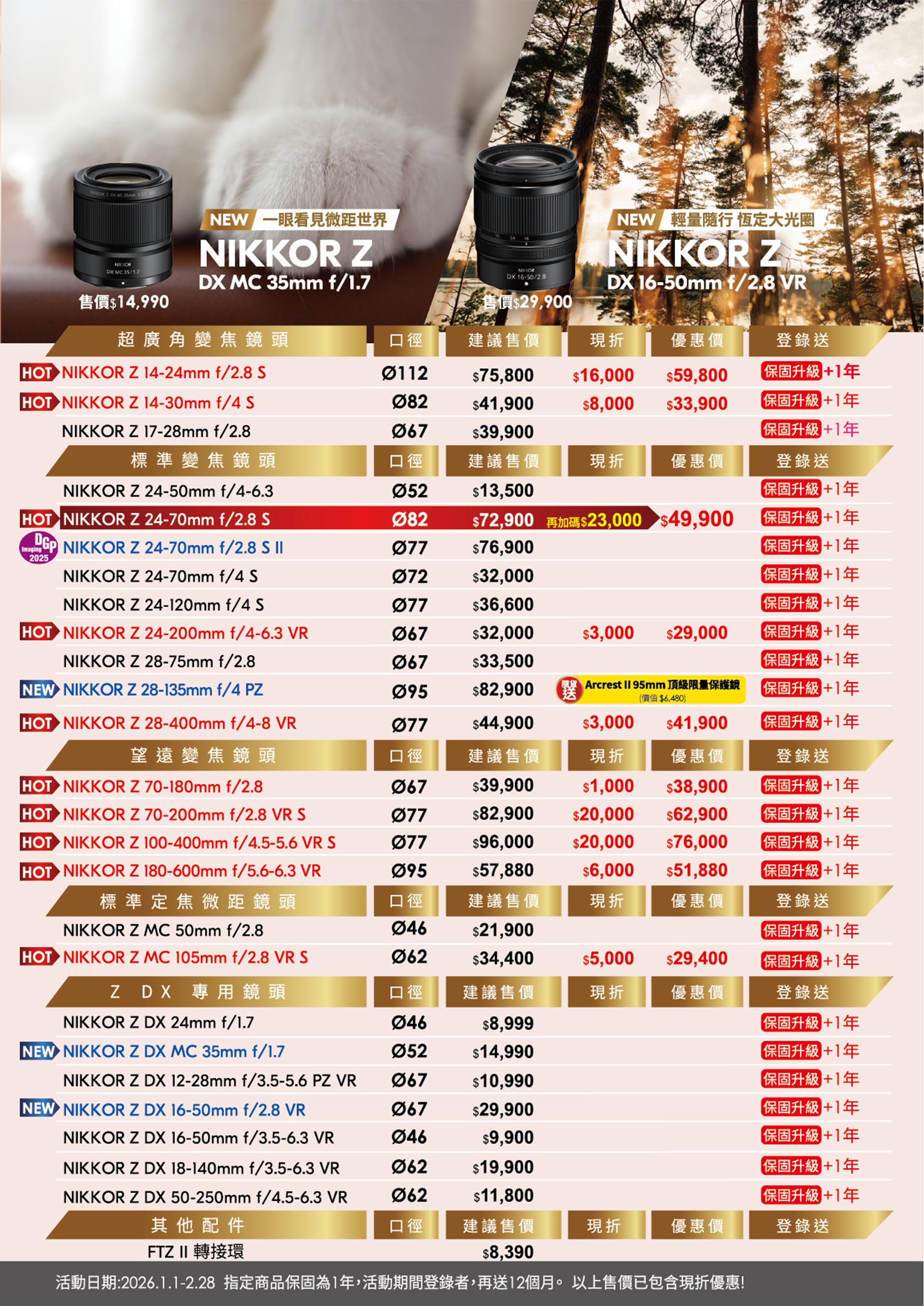 🔥115/1/1~115/2/28🔥活動期間購買,Z系列鏡頭登錄贈保固升級2年 + PGY多功能包布