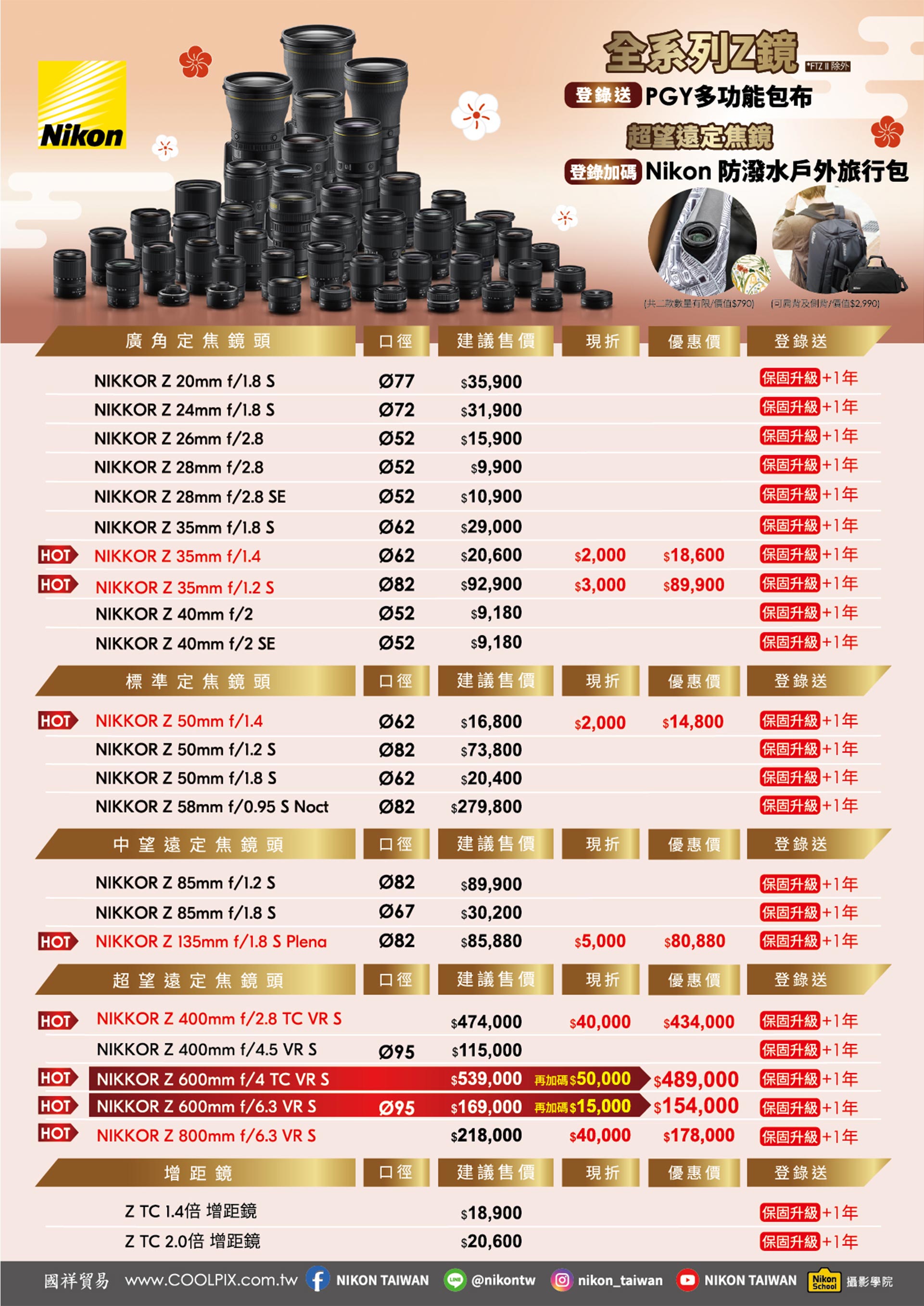🔥115/1/1~115/2/28🔥活動期間購買,Z系列鏡頭登錄贈保固升級2年 + PGY多功能包布