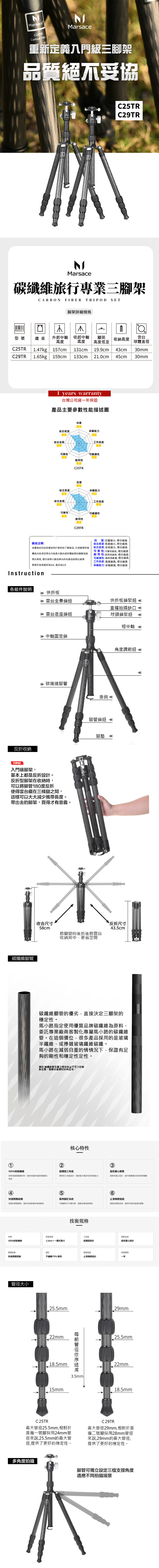 Marsace 馬小路 NEW C25TR 反折碳纖三腳架雲台套組 CP值首選